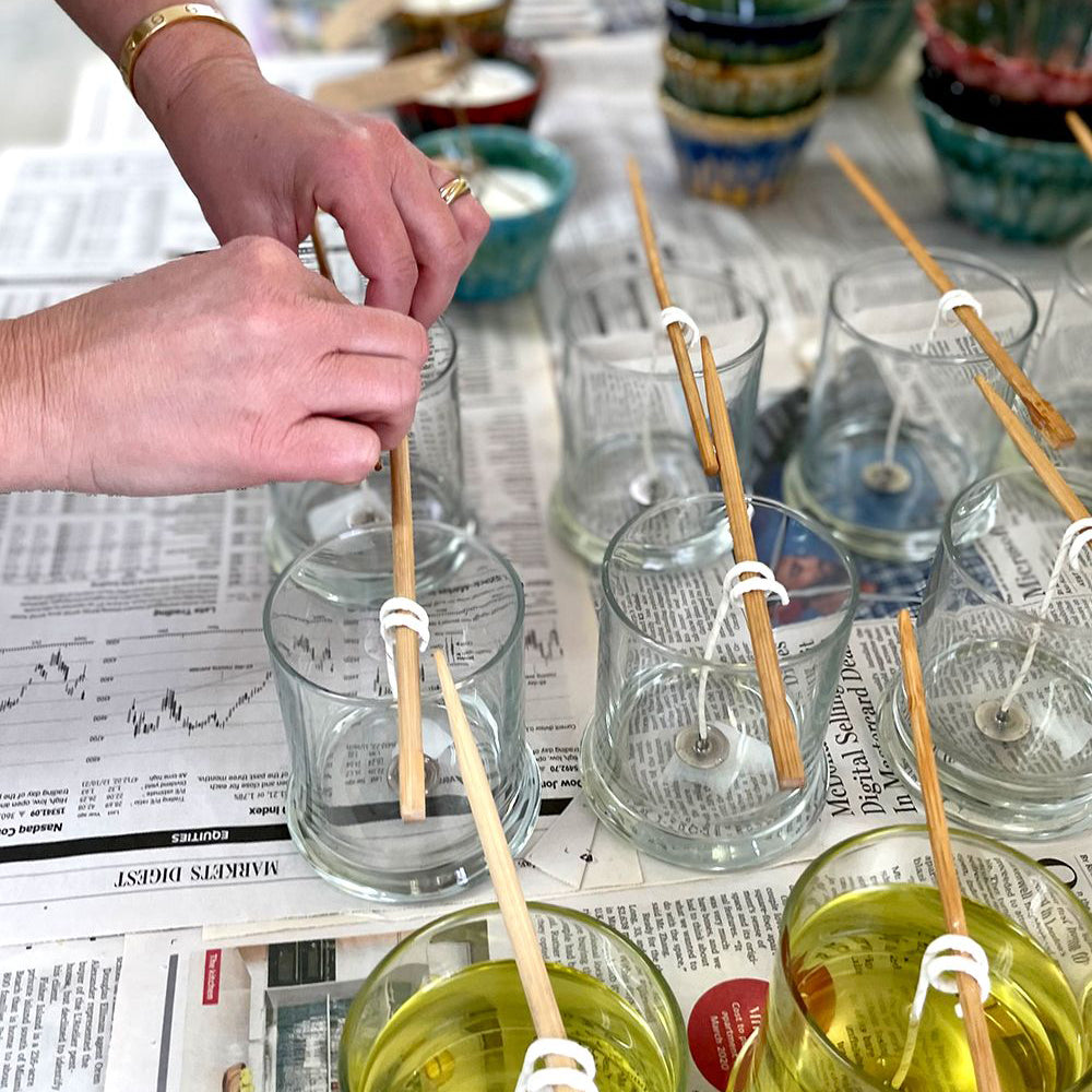 Preparing the wicks prior to pouring.